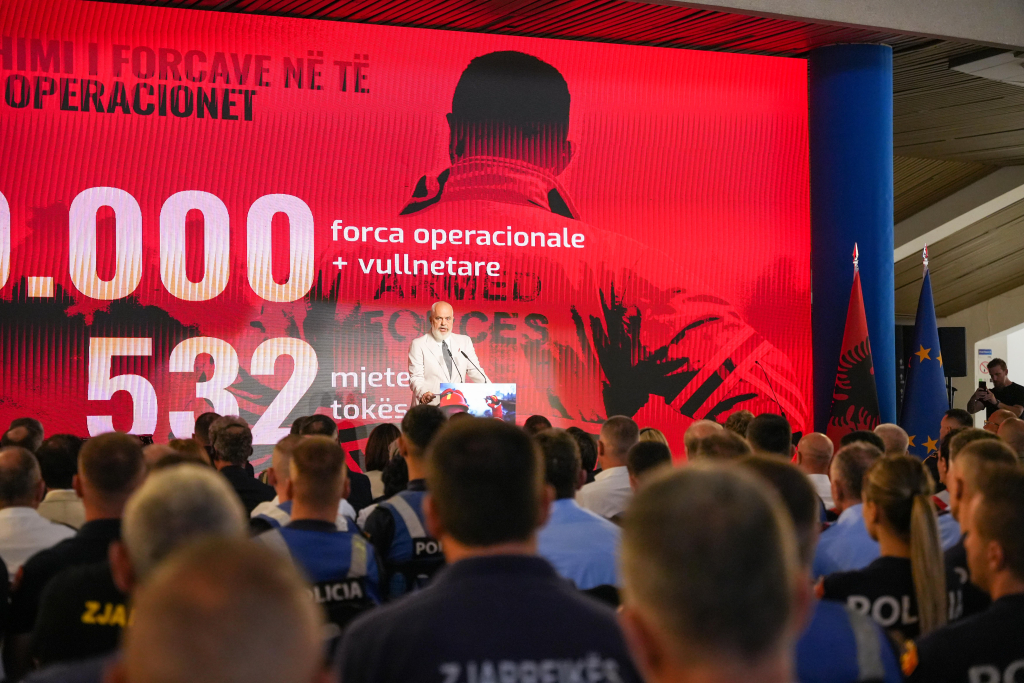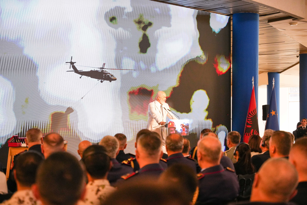 “Jemi sot këtu për të shprehur mirënjohjen dhe për t’u përulur me respekt përpara jush dhe të gjithëve atyre që ju këtu përfaqësoni. Beteja e zjarrit që përfshiu territoret e konsiderueshme të vendit tonë në dy muajt e fundit ishte një kronikë e gjatë ethesh, plagësh, dhimbjesh, një kronikë dramatike por me nota stërmundimi, përkushtimi dhe me momente kulmore edhe heroizmi njerëzor që i bëjnë nder uniformave tuaja dhe falë jush, nderojnë shtetin shqiptar,” – theksoi Rama gjatë fjalës së tij.