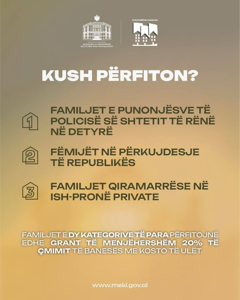 🔹 Grant i menjëhershëm prej 20% të çmimit të banesës për familjet e punonjësve të rendit të rënë në detyrë dhe fëmijët në përkujdesje të Republikës.